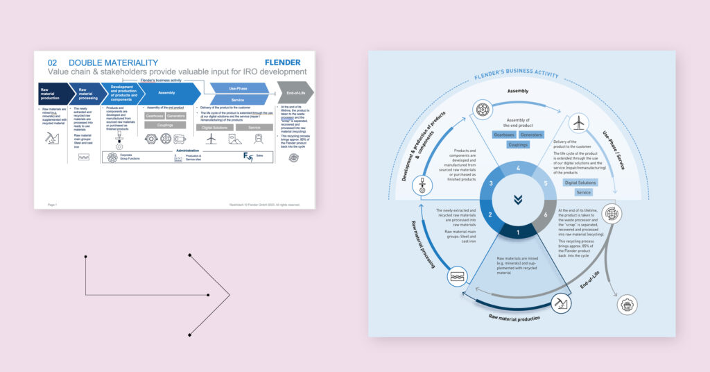 Geschäftsberichte sind oft umfangreich, mit hunderten Seiten voller Daten, Kennzahlen und Strategien. Ohne klare visuelle Struktur verlieren Leser:innen schnell den Überblick. Durchdachtes Design im Reporting sorgt dafür, dass selbst komplexe Inhalte verständlich bleiben. Statt unübersichtlichen Tabellen bieten visuelle Elemente wie Kreislaufdiagramme oder Infografiken einen schnelleren Zugang zu Informationen. So wird etwa eine komplexe Wertschöpfungskette visuell greifbar und leichter erfassbar – ganz ohne Textflut.