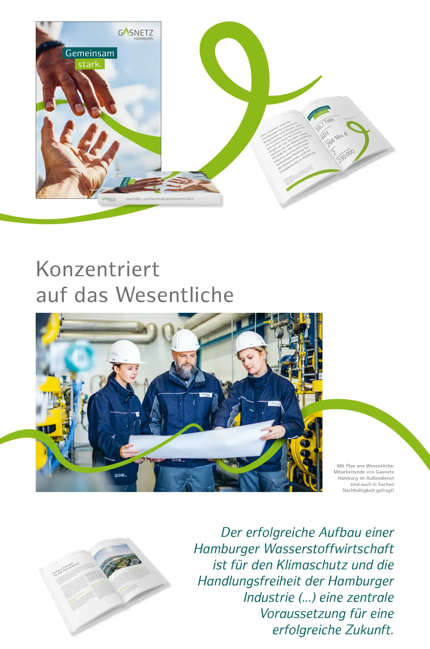 In close cooperation with our sustainability experts, Gasnetz Hamburg has not only identified concrete sustainability goals for itself, taking into account the United Nations Sustainable Development Goals, but has also developed a clearly formulated sustainability strategy and integrated it into the overarching corporate strategy. Packaged in a fresh design, the Gasnetz Hamburg report uses an energy band to highlight how the municipal company unites climate protection and sustainability with the people in and around Hamburg.