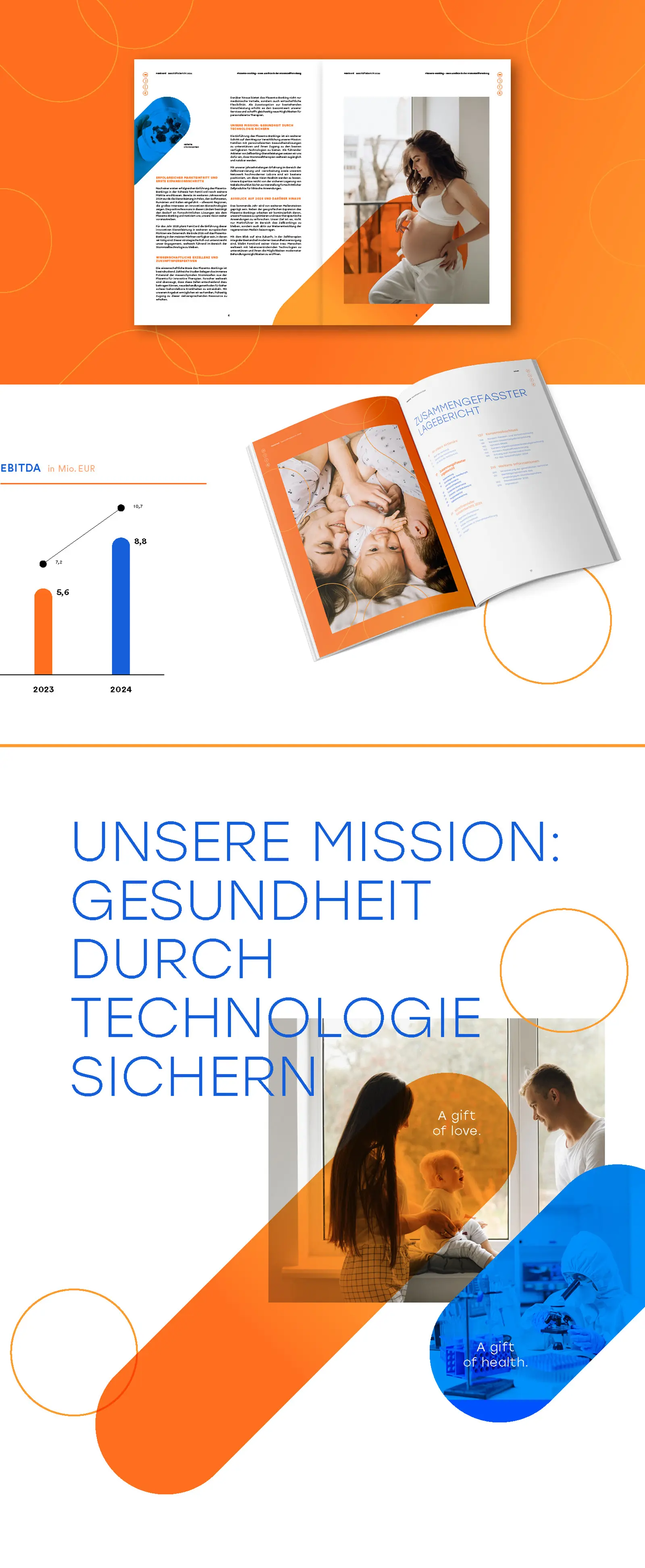 Das 1997 in Leipzig gegründete Unternehmen rückt das Thema Familie auch gestalterisch in den Mittelpunkt des von uns konzipierten Geschäftsberichts. Emotionale Bildwelten, eingebettet in den neuen Firmenfarben Blau und Orange, verleihen dem Bericht eine warme und stimmige Atmosphäre. Farbharmonisch gestaltete Grafiken und Tabellen runden das Gesamtbild stimmig ab.